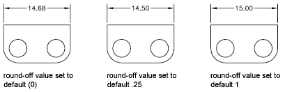 You can round off all dimension values except those for angular dimensions. For example, if you specify a round-off value of 0.25, all distances are rounded to the nearest 0.25 unit. The number of digits displayed after the decimal point depends on the precision set for primary and alternate units and lateral tolerance values.