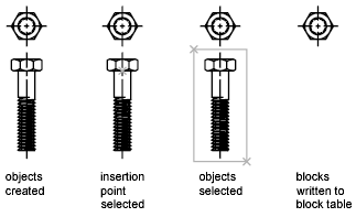 The following illustration shows a typical sequence for creating a block definition within a drawing.