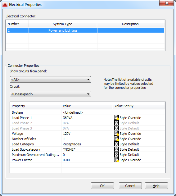 Note: The circuits available for Circuit are the circuits in the current drawing, or in the electrical project database file, if one is specified for the current drawing. The circuits available are those that match the values you have specified for the connector properties, and have either a system type of General or the same system type as the connector. Beside each circuit name, the current load on the circuit is displayed. The load is the total load on the circuit across all applicable drawings, including the electrical project database file.