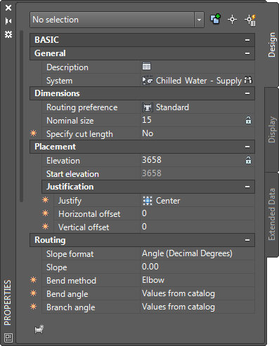 Properties on the Design tab of the Properties palette that you use to add pipe objects.