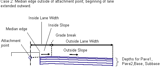 Width of the inside lane for the condition where there is no median; that is, from the attachment point to the grade break point. |