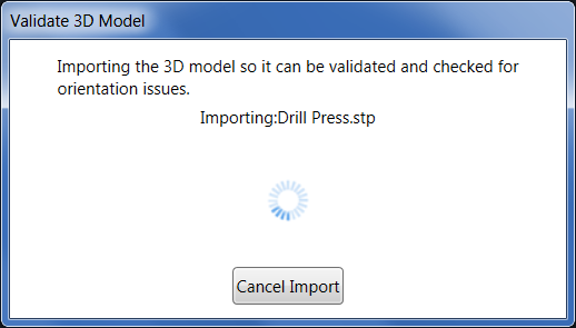 Validate 3D Model dialog box opens and displays the following message as it imports the 3D model into your layout.
