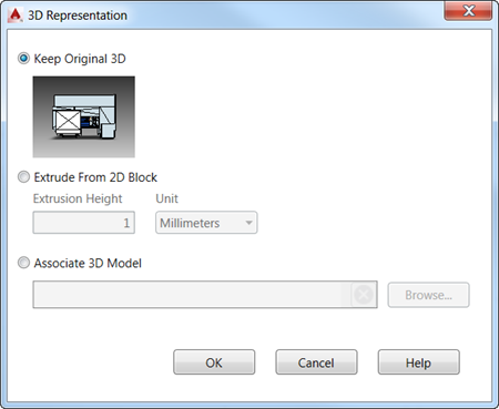 This topic describes two different methods to create a 3D representation from a 2D block asset: Extruding from a 2D block or associating a 3D model. Both procedures are performed using the