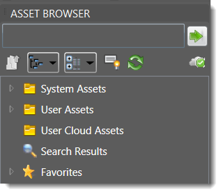 The Asset Browser provides access to System Assets, User Assets, Cloud-based Assets, Vault Assets and asset search results.