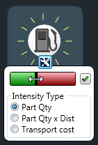 Displays the transportation costs based on the selection. Reposition stations to alter analysis results. Transportation costs are derived from several variables defined in the Factory Options. |