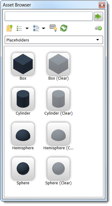 Solid and transparent boxes, cylinders, spheres, and hemispheres are installed with Factory Design and stored in the Placeholders system assets folder.