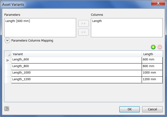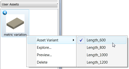The following procedure describes the steps necessary to create an asset with variants. The asset example used is a simple rectangle that is 600 mm long, 400 mm wide, and 100 mm thick. Four asset variants are defined that produce lengths of 600 mm, 800 mm, 1000 mm, and 1200 mm.