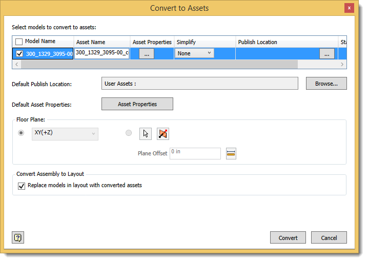 Replace models in layout with converted assets to automatically replace the model in the current layout with the newly created assets. If you do not select this option, the assets are still created and added to your user asset library, but the model remains in the layout.