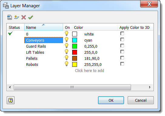 With layers, you can create, rename, turn visibility on/off, assign colors, and delete layers for your 3D assets in the Inventor Factory layout using a dialog box. Layers can also be imported from an existing DWG.
