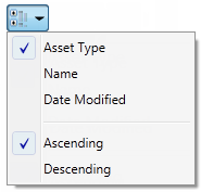 You can expedite the search for an asset by sorting the assets by type, name, or modification date. You can also choose to display the sorted assets in an ascending (the default) or descending order. The sorting method you choose is persistent; that is that it remains in effect during subsequent sessions of Inventor Factory. Click the down arrow on the