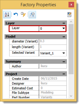 Factory Properties browser. If multiple assets on different layers are selected, the layer name appears as