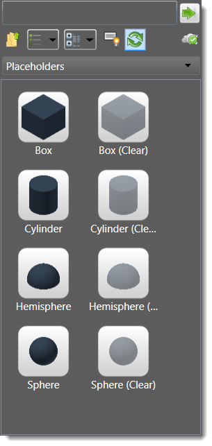 Solid and transparent boxes, cylinders, spheres, and hemispheres are installed with Factory Design and stored in the Placeholders system assets folder.