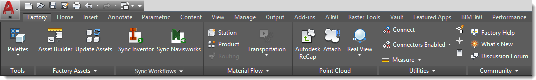 Community. A blend of Factory and standard AutoCAD panels create the default Factory working environment.