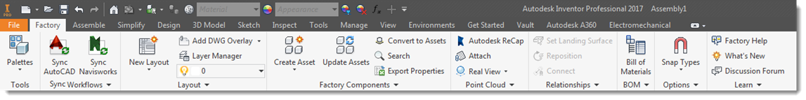 The Factory Design Utilities user interface is located on the Factory tab and laid out with panels named Tools, Sync Workflows, Layout, Factory Components, Point Cloud, Relationships, BOM, Options, and Learn. A blend of Factory and standard Inventor panels create the default Factory working environment.