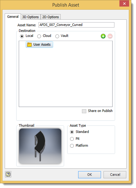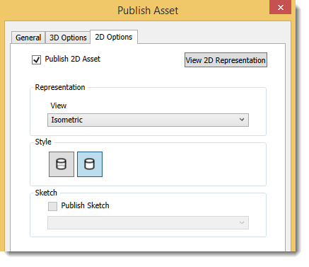 2D Options tab if you want to publish a 2D drawing of the asset in DWG format. Publishing a 2D drawing of a 3D asset creates a 2D asset for use in AutoCAD Factory. The asset is automatically placed in the