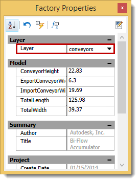 Factory Properties browser. If multiple assets on different layers are selected, the layer name appears as