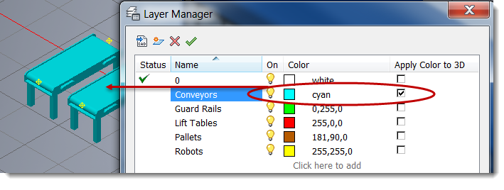 Note: Remember that layer colors only appear in AutoCAD Factory after using the