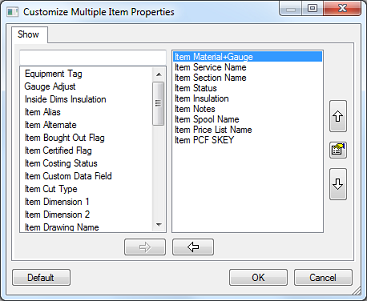 This dialog specifies which properties are displayed in the Item Properties dialog only when multiple items are selected. These settings do not affect the properties that are displayed when you select a single item. The dialog organized into two panes. The left pane contains all the properties that are available for display when editing multiple items. The right pane displays the properties that currently display in the Multiple Item Properties dialog.