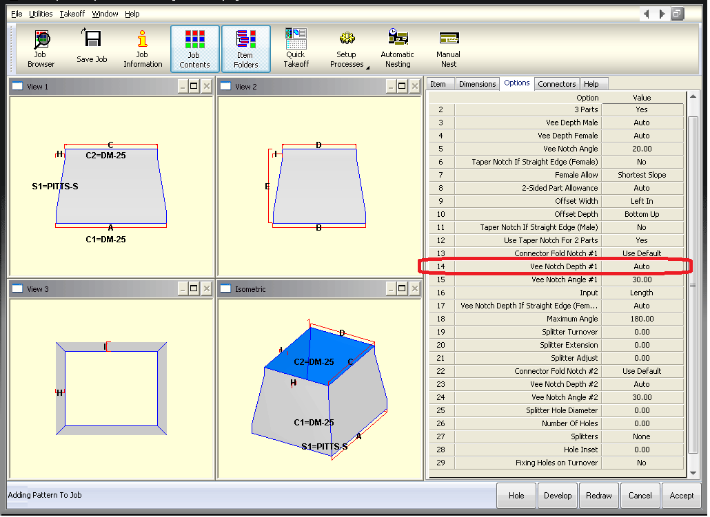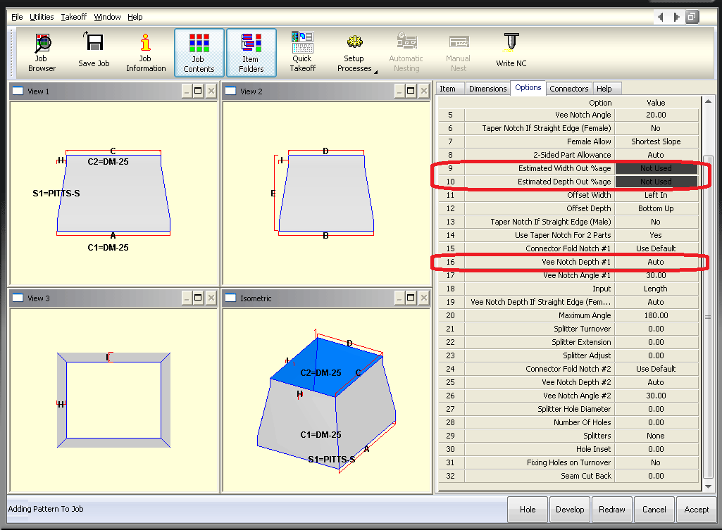 Note that this feature is only useful for users who import fittings into the program using the ASCII text file format. The example below illustrates the impact of this setting on the Taper pattern, CID number 2. When the Show Hidden Options is not checked, the example below shows how this pattern would display on the Takeoff dialog. Note that the Vee Notch Depth option displays as the fourteenth entry in the dialog.
