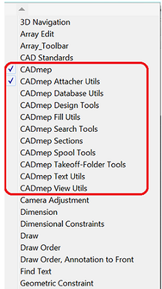 To display the CADmep toolbar, type TBAR at the command line and press Enter. If the CADmep toolbar is already displaying, this command is ignored. To turn off (hide) the display of the CADmep toolbar, click the small X(close) button located at the end of the toolbar. You may need to mouse hover over the toolbar to display the small X (close) button.