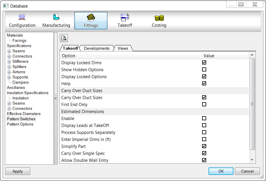 Show Hidden Options: Some fittings use options that are set by the pattern and cannot be changed. Under normal circumstances, these options are not displayed. However, when importing a file or files through an ASCII text file, the true position of pattern options is required, including any hidden ones. When this switch is enabled, all pattern options, including hidden options, are displayed on the Options tab of the Takeoff dialog. This feature is only useful when importing fittings using the ASCII text file format. For more information on hidden options, see