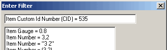 The search can also be made up of multiple filters to allow for greater control; for example, Item Custom Id Number (CID) = 535 and Item Description not Fire Damper Flanged.
