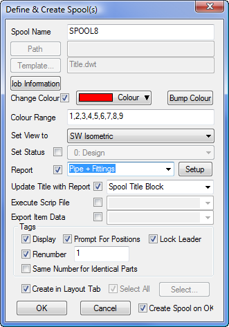 - Create Spool on OK: Check to create the spool drawing. Leave unchecked if you wish to change settings and update an existing spool.