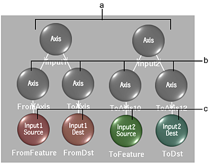 (a) Spline node trees for one Front1 (Input1), and one Front2 (Input2) spline (b) Axis nodes for individual spline wireframes (c) Spline nodes for corresponding source and destination splines