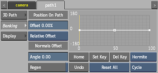 - Adds twists and torsion to the normals of the 3D path. Use the options in the Tools box to add, select, delete, or move keyframes on the Banking curve. The horizontal axis represents the length of the path, and the vertical axis displays the orientation, expressed in degrees.