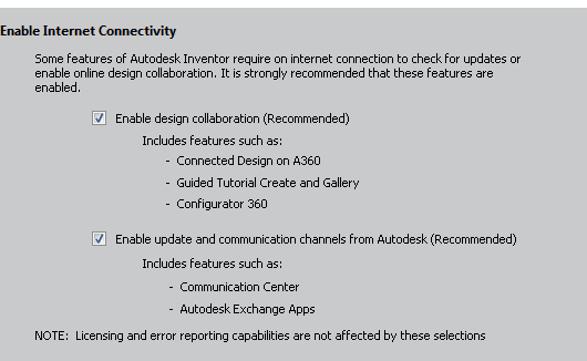 Note: The Enable Internet Connectivity settings only control access to the specific features listed below. These settings do not control online access from within Inventor to other online features such as licensing, your autodesk account, Team Web, CER, CIP/DAP, the online help, samples, and other online features.
