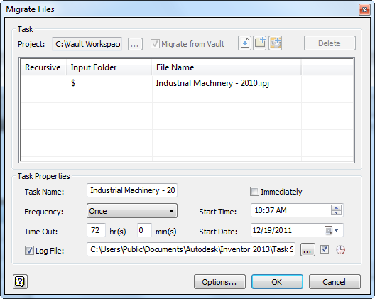 You can manually check out old files and save them then check in to Vault to migrate them. or you can migrate them automatically using Task Scheduler. These sections describe how to migrate your files to the new release of Inventor in Vault using Task Scheduler.