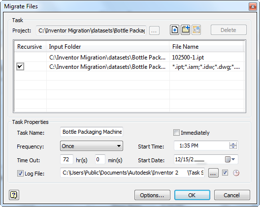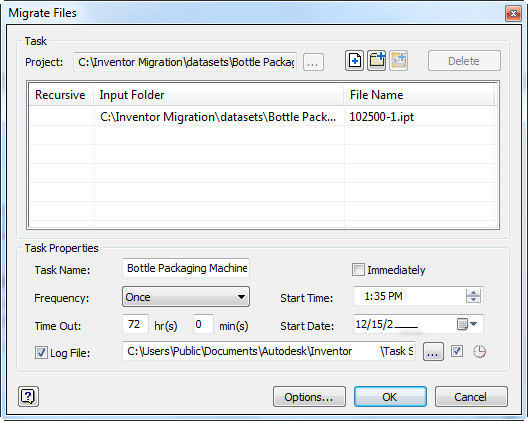 Task Scheduler generates a log file that records which files successfully migrated and which did not. The file is in ASCII format (.txt) and is located in C:\My Documents\Inventor <version>\Task Scheduler\Log & Report Files or C:\Users\Public\Documents\Autodesk\Inventor <version>\Task Scheduler Logs & Reports by default.