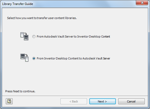 - Click "Transfer Library Guide..." button to get Transfer Library Guide dialog. See Figure 2. Select From Inventor Desktop Content to Autodesk Vault Server.