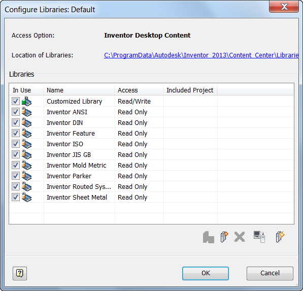 - in Project dialog, click "Configure Content Center Libraries" button to get Configure Libraries dialog. See Figure 1.