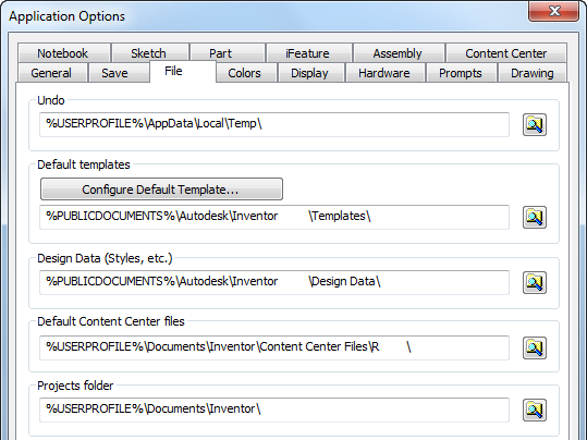 C:\Users\Public\Documents\Autodesk\Inventor <version>\Design Data folder. The style library location is also available from the Application Options, File tab. If you work in a networked environment, this folder resides in a shared location on the network, and not on your local hard drive. If you are unsure of this location, check with your IT or CAD Administrator.