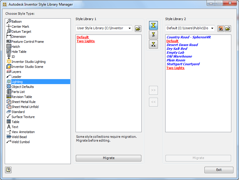 - If you did not modify the style library that was shipped with the previous release, it is not necessary to migrate it. Use the style library that is supplied with the new release of Inventor.