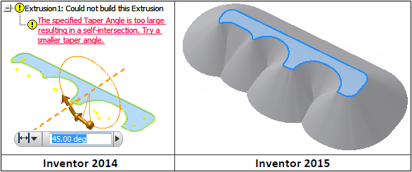 The robustness of Shelling and Tapered Extrusions is improved. They now handle more complicated geometries. For example, in Inventor 2014, you can extrude the following profile with proper tangent constraints with a taper angle of up to only 27 degrees. In Inventor 2015, the taper angle can be anywhere from 0 through 90 degrees.
