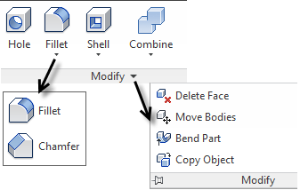 Several commands were moved from a main panel to the subpanel, or to a drop-list on the panel. For example, in a part file (.ipt) the Modify panel on the 3D Model tab is now streamlined to display fewer commands by default. The other Modify commands are moved to a drop-down menu or to the Modify expanded panel: