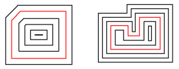 The following illustrations show examples of geometry created with the improved Offset command. The original sketch geometry is highlighted red, geometry created by the Offset command with sample offset distances is black.