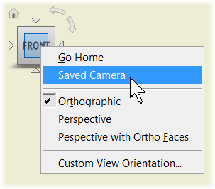 For drawing views based on a presentation view of the model, you can access and apply camera settings saved in the presentation file (.ipn). Right-click the View Cube, and click Saved Camera.