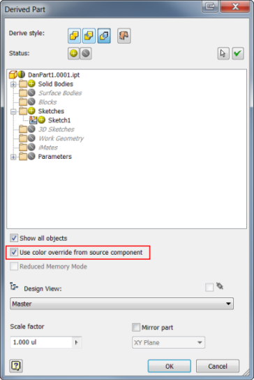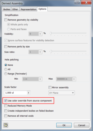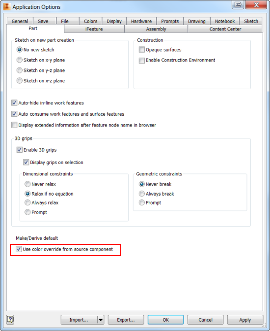 A global setting can be set to default the Use color override from source component check box to remain checked or unchecked throughout your session. This check box can be accessed through the Application Options dialog box under Make/Derive default, under the Tools tab in the ribbon.