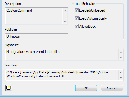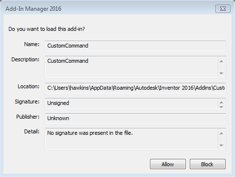 When a non-Autodesk product add-in is loaded, a new dialog box displays. You can now choose to Allow or Block an add-in from loading. This setting will be retained for future sessions. You can examine and change the Allow/Block settings using the Add-In Manager.