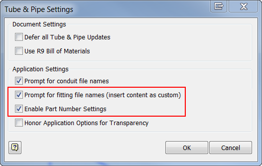 Part Number Settings: The Part Number Settings field is made available by selecting the Enable Part Number Settings check box in the Tube and Pipe Settings dialog box. New options within this dialog box are: