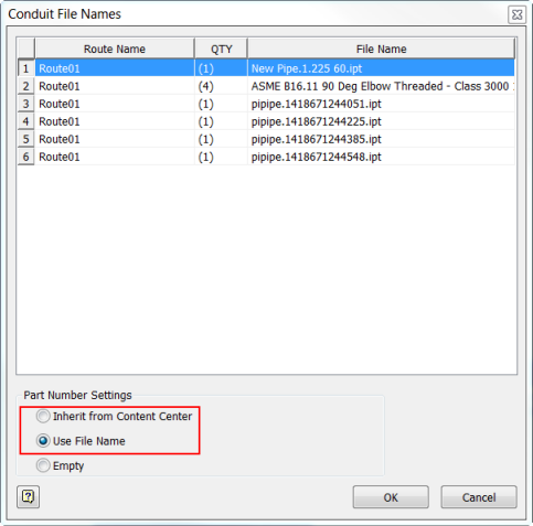 Enable Part Number Settings: Allows you to populate a part number into the parts list within the drawing environment. The part number is updated within the part file and then populates the parts list. This option also makes available the Part Number Settings options in the Conduit File Names dialog box.