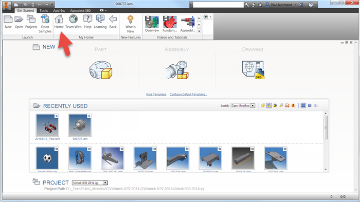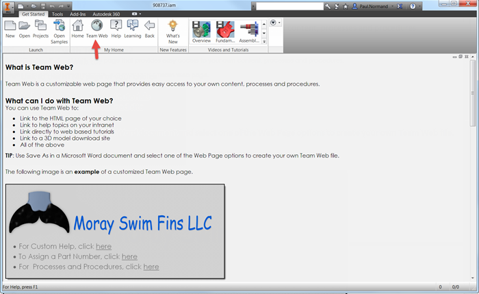 You can start Team Web from multiple locations, including the Get Started tab, My Home panel. An application option in the Files tab lets you to make Team Web the default for the Inventor Home screen.