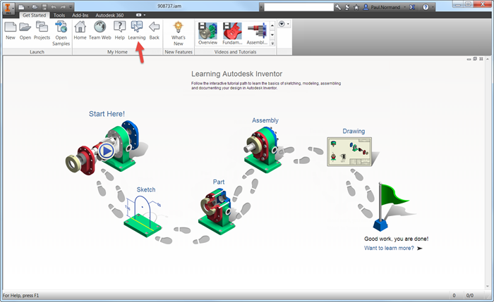 Click the Learning entry on the Get Started tab, My Home panel to access the tutorial learning path. The tutorials provide a guided path to learning the basics of sketches and parts, assemblies, and drawings in a complete end to end workflow. Progress tracking shows what you complete. The enhanced interactive tutorial UI provides a better visual experience.
