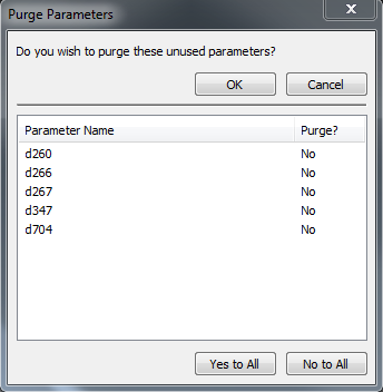 To retain a parameter listed in the window, leave the default setting of No. To purge a parameter listed in the window, you can click the default setting of No to Yes before you execute the purge. Unused, exported parameters default to No in case they are used in other documents.