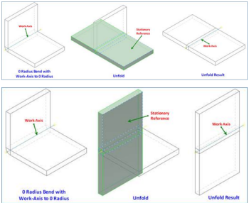 You can unfold and refold imported third-party sheet metal models with a zero radius bend. In the sheet metal environment, Unfold/Refold command, under Unfold Geometry, you can now select a zero radius bend. You can flatten the zero radius bend when you create a flat pattern.