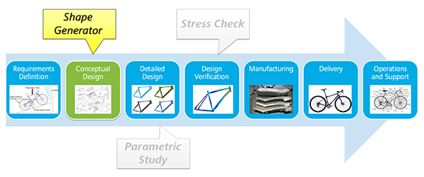 Shape Generator is aimed at the early stages of conceptual design. It uses inputs you provide to generate a reference shape for a structurally efficient part. Using that reference shape as a design guide, you then modify the part shape to resemble the reference shape. Then, you can further optimize the design by using simulation and stress analysis.