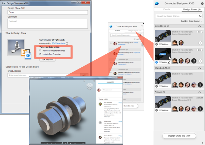 A Design Share capability was added in Inventor 2016 R3 to facilitate design reviews with your team and other project collaborators anywhere, on any device. Several enhancements in Inventor 2017 make it faster and easier to collaborate. Collaborators and feedback can now be reviewed and managed directly inside Inventor. New controls permit you to share part properties and part names in addition to the model graphics for more detailed reviews.